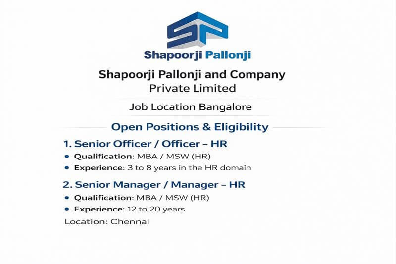 Shapoorji Pallonji and Company Private Limited is one of India’s most respected Engineering & Construction organizations, known for delivering iconic projects across infrastructure, real estate, industrial, and commercial sectors. As part of its continued growth, the company is hiring experienced HR professionals for its Bangalore operations.
