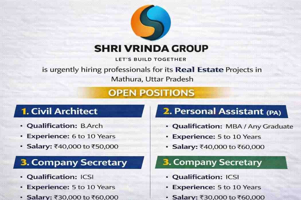 Shri Vrinda Group is a growing real estate company engaged in residential and commercial development projects. The organization is known for delivering quality construction and is now expanding its team to support ongoing and upcoming projects in Mathura.