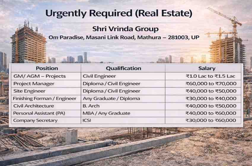 Shri Vrinda Group is urgently hiring professionals for its real estate projects in Mathura. The company is looking for experienced candidates across project management, engineering, architecture, and administration roles.
