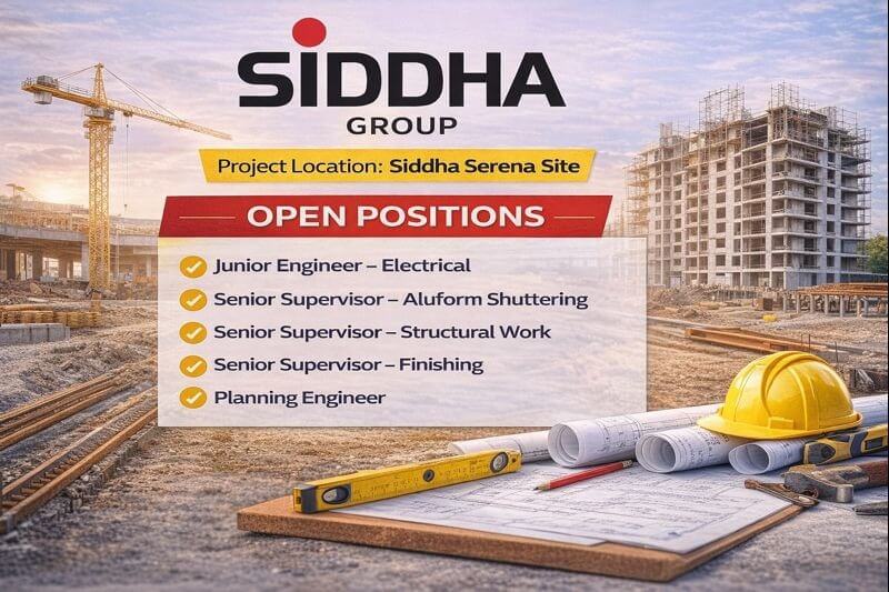 Siddha Group is hiring experienced professionals for multiple roles at its Siddha Serena Project Site. The organization is known for delivering high-quality residential and real estate developments and offers a professional work environment with growth opportunities.