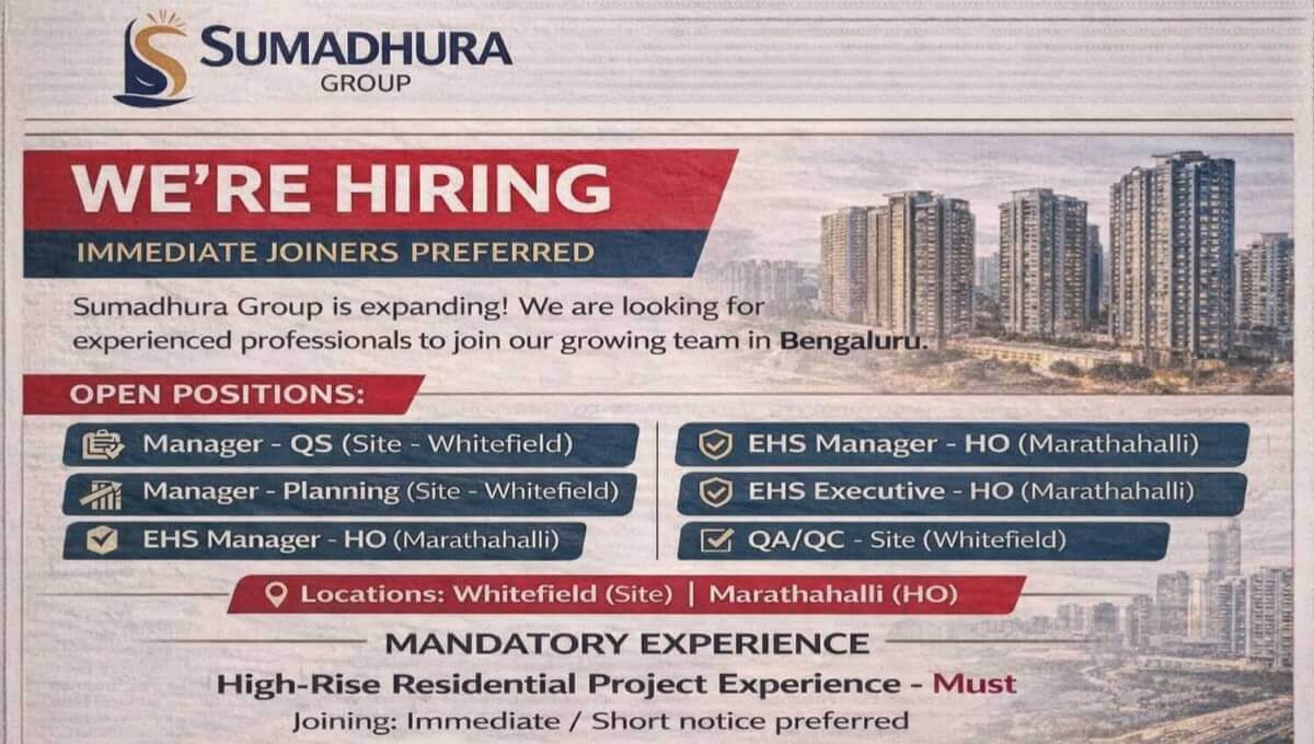 Sumadhura Group Recruitment 2026 | High-Rise Residential Projects in Bengaluru