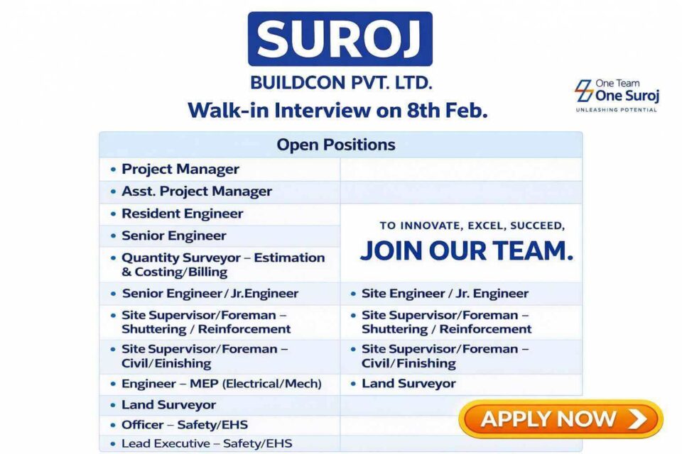 Suroj Buildcon Pvt Ltd Walk In Drive | ITI, Diploma, and Degree