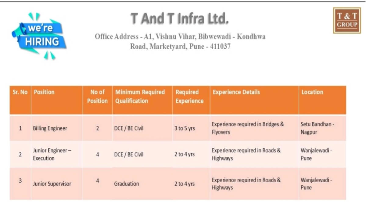 T & T Infra Ltd. is inviting applications from experienced professionals for its ongoing Bridge, Flyover, Road & Highway Projects in Nagpur and Pune.