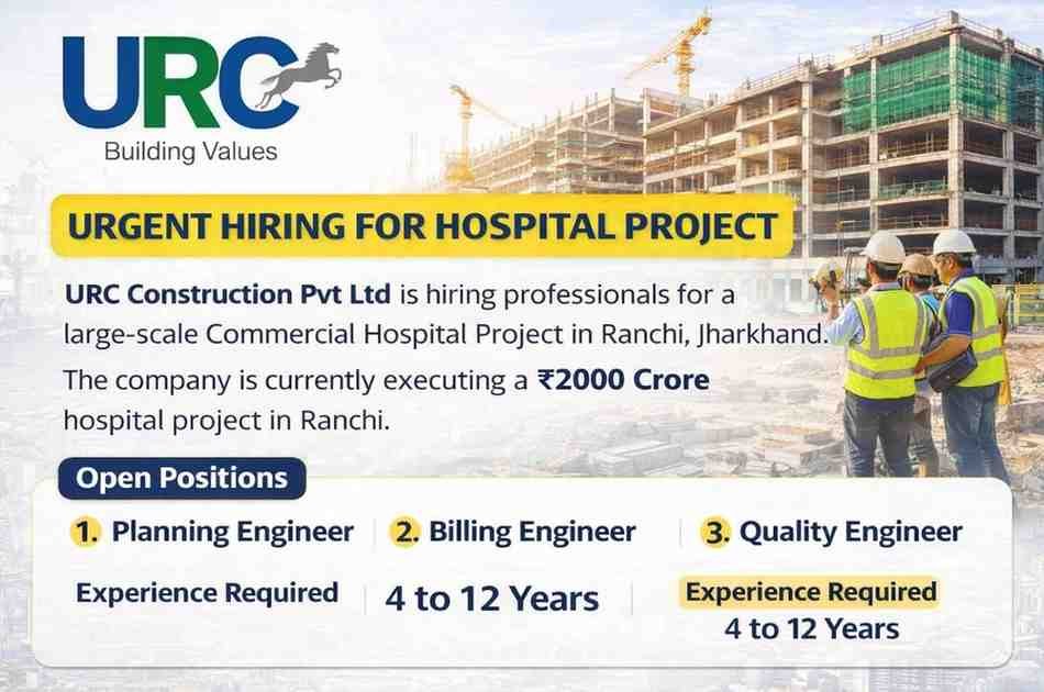 URG Construction Pvt Ltd is hiring professionals for a large-scale Commercial Hospital Project in Ranchi, Jharkhand.