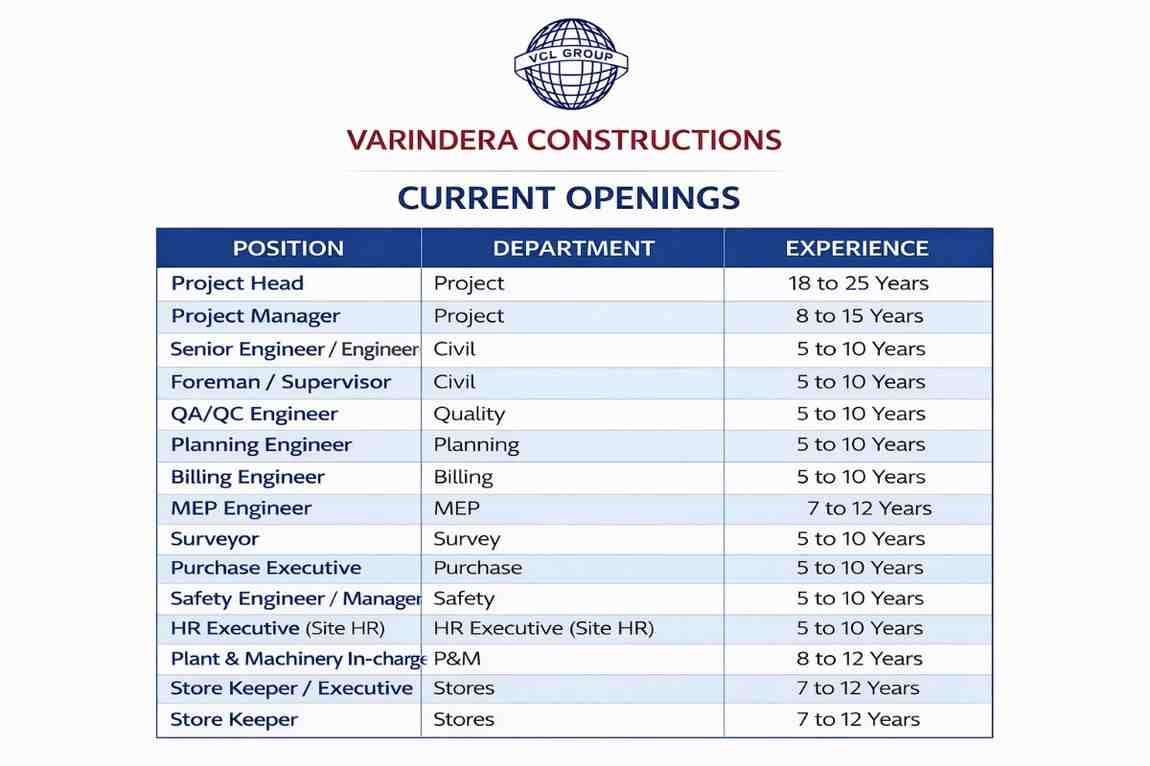 VCL Group we are conducting a recruitment drive for a large-scale industrial Building Project in Jamnagar, Gujarat.