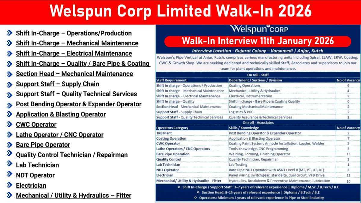 Welspun Corp Limited Walk-In 2026 | Operations, Mechanical, Electrical & Coating Jobs Open | 11th January 2026 | Diploma, M.Sc., B.Tech, B.E.