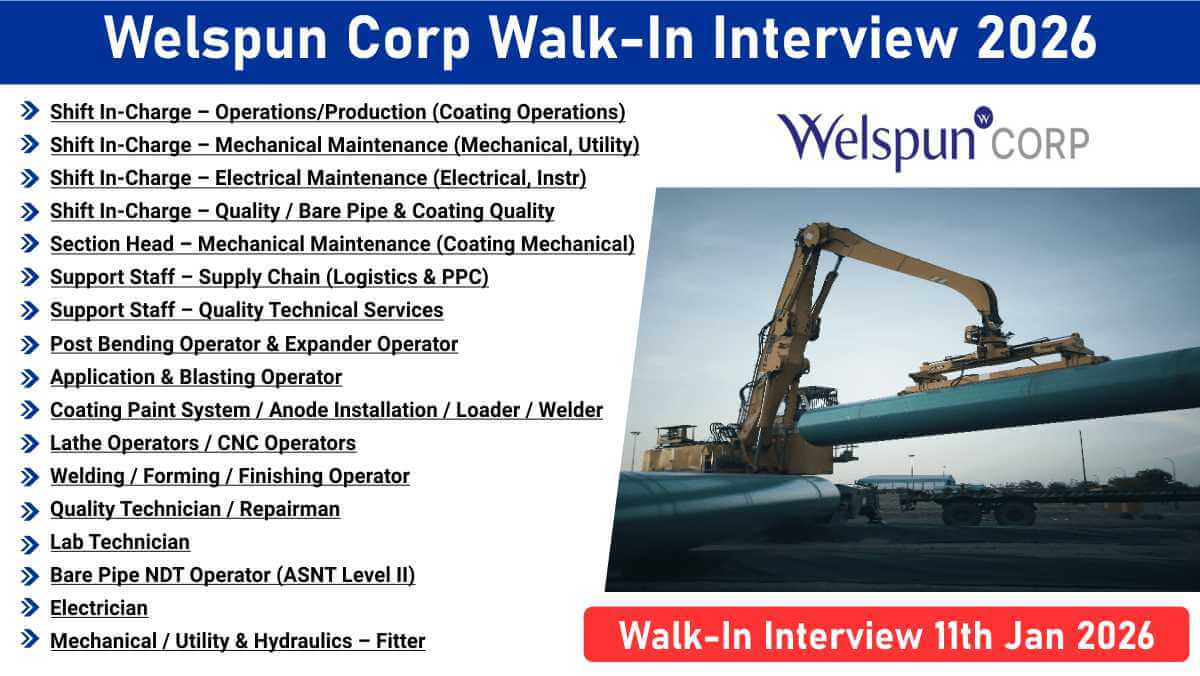 Welspun Corp Walk-In Interview 2026 | Mechanical, Electrical & Production Jobs in Anjar, Kutch | 11th Jan 2026